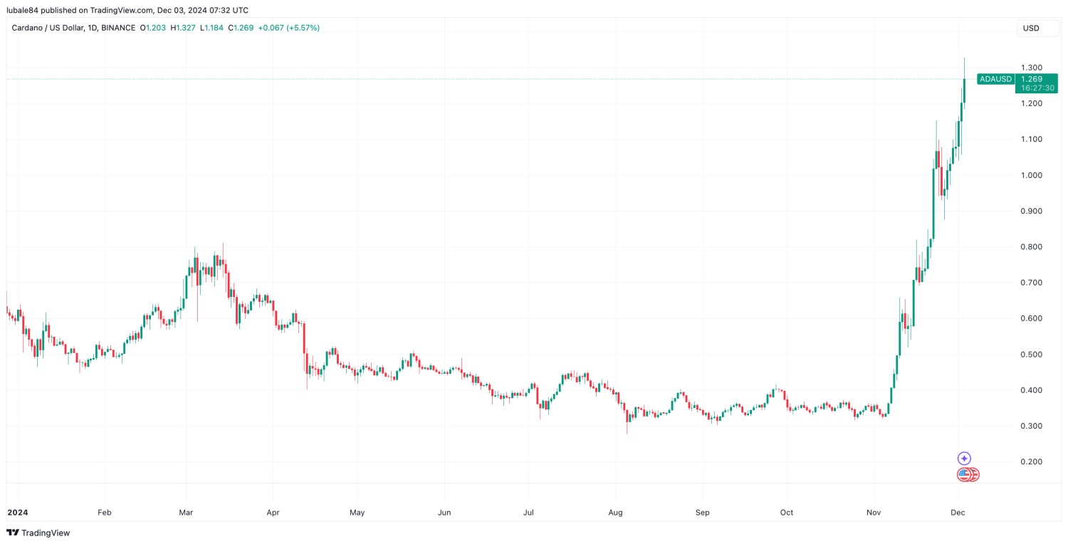 12月3日,Cardano(ADA)延续其上涨趋势,在过去24小时内上涨17%,交易价格达到1.27美元。从11月5日以来的累计涨幅超过280%,推动这一Layer-1代币攀升至32个月高点1.32美元。