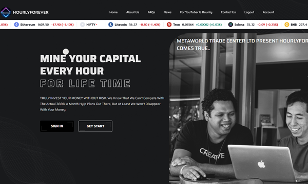 0.01%-0.04% hourly forever; 2%-10% each business day for 100 days and principal included; 110%-200% after one week; 300%-800% after one month (investor can release capital after 30 days with 5% fees; after 60 days with 3% fees; after 90 days with no fees)
