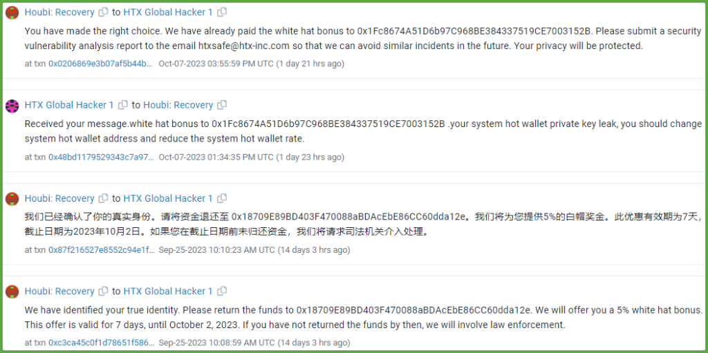 在超过HTX指名的期限后,HTX并没有公布相关司法机关介入处理的消息;但黑客却主动还钱了,甚至连5%的白帽奖金都没有预拿。